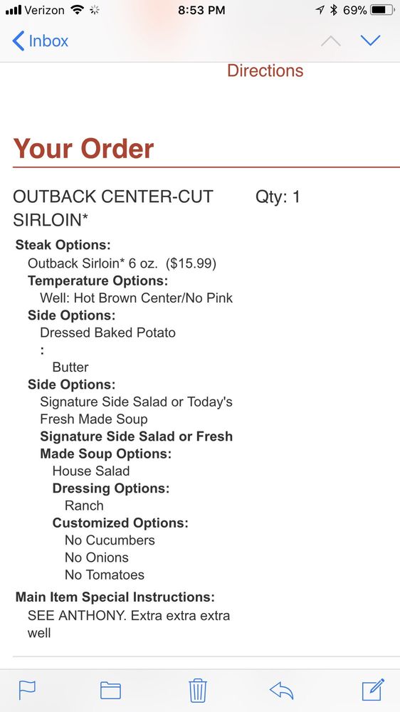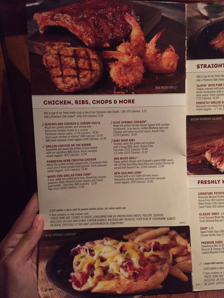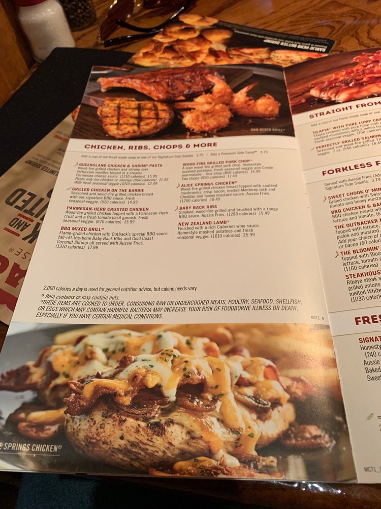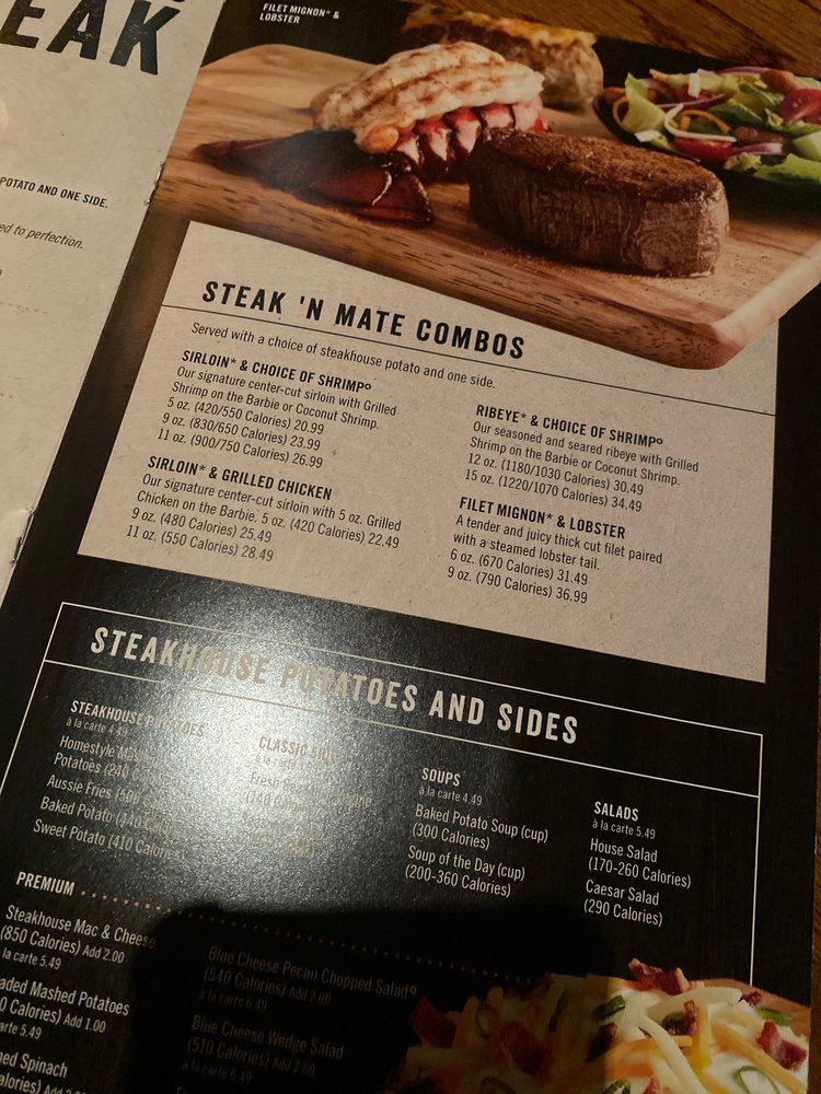 Outback Center-Cut Sirloin- paired with a 5 oz grilled chicken breast topped with sauteed mushrooms, crisp bacon, melted Monterey Jack and Cheddar and honey mustard sauce. Served with two freshly made sides.